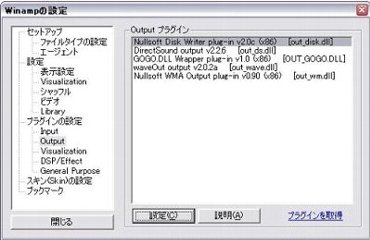 まずはWINAMPのオプション→設定→プラグインの設定→Outputで、Outputプラグインに『Nullsoft Disk Writer plug-in』を選択します。