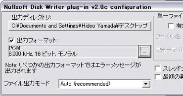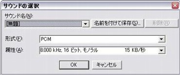 出力フォーマット右側にある『…』ボタンを押して、『サウンドの選択』ダイアログを出します。そして形式には「PCM」を、属性には「8.000KHz, 16ビット, モノラル 15KB/秒」を設定します。今後何度も使用するのであれば『名前を付けて保存』ボタンを押して今の設定を保存しておけば、次回からは簡単に設定できます。